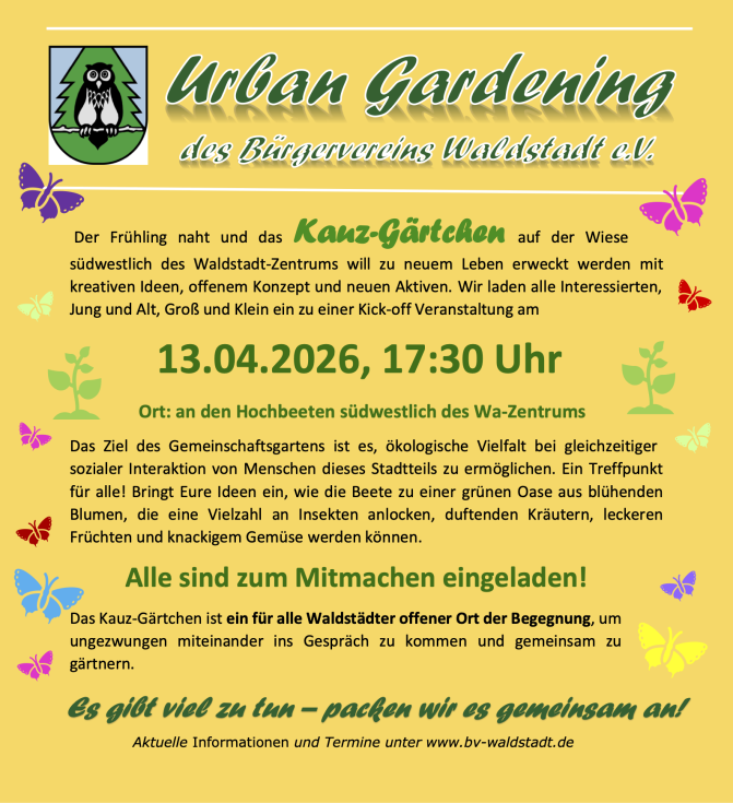 Wer sich den fleißigen Gärtnerinnen und Gärtnern des „Kauz-Gärtchens“ anschließen möchte, ist herzlich willkommen. Eine Möglichkeit, gemeinsam mit Gleichgesinnten zu gärtnern, ein Stück Garten für diejenigen, sie selbst keinen haben, ein schöner Treffpunkt in der Waldstadt für alle: Das soll das neue „Kauz-Gärtchen“ werden!